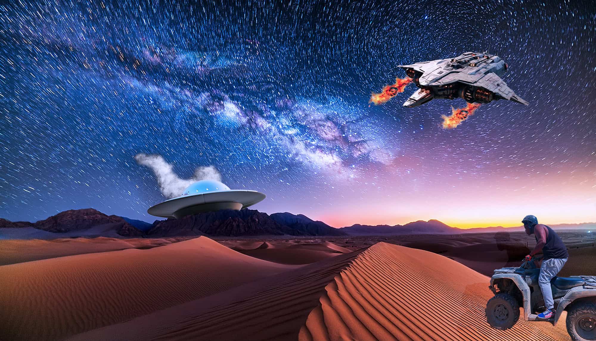 I created a composition by placing an image of my friend on a dune buggy within a Star Wars–themed background.